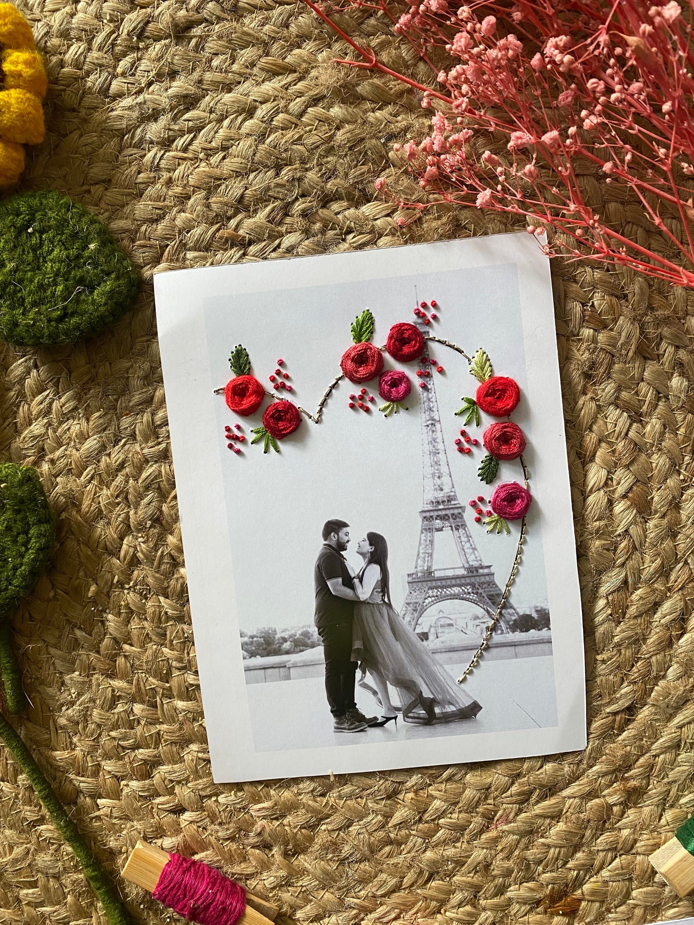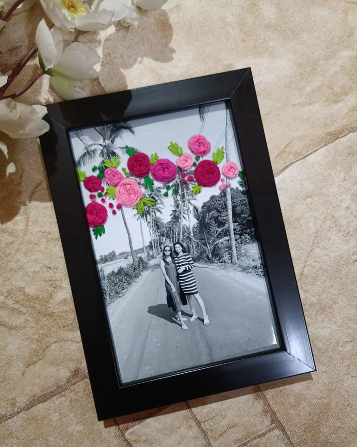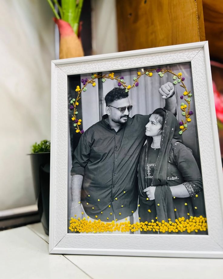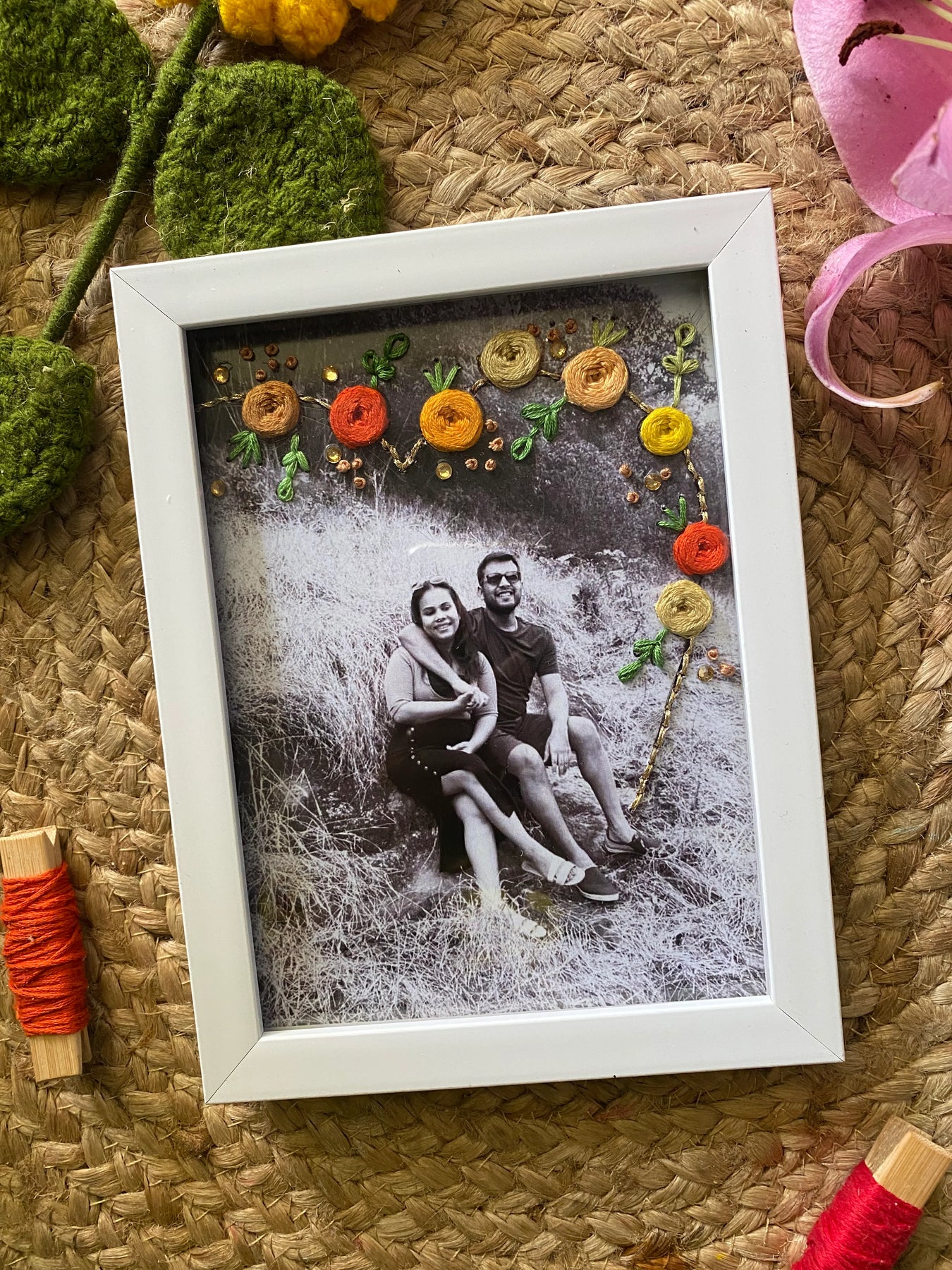 Your cherished photo is enhanced with beautiful hand embroidery — floral designs, names, or dates — and framed to perfection. A heartfelt gift or a stunning décor piece!